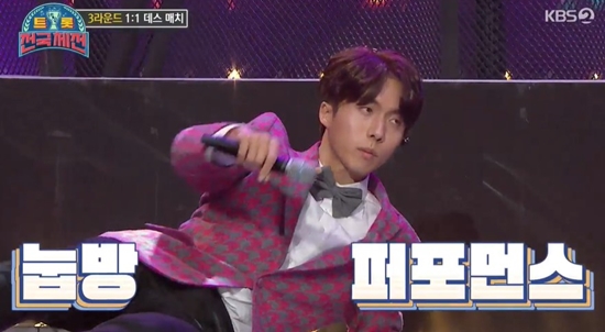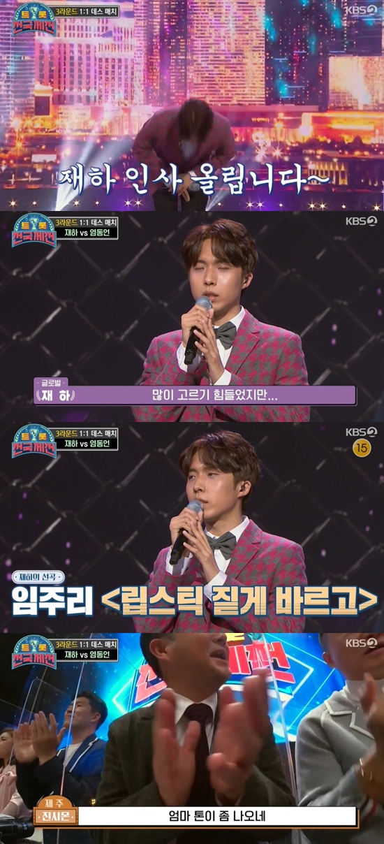 막강한 우승후보인 진해성의 라이벌로 손꼽히며 트로트 신흥 강자로 급부상한 재하는 재치 가득한 퍼포먼스로 등장했다.