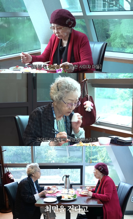 그러자 사미자는 "걔가 많이 아플 때마다 영옥이 생각이 또 난다"며 안타까운 사고로 하반신 마비가 된 손자를 간적접으로 언급했다. 그는 "얼마나 슬펐을까. 이렇게 딱 그냥 잊어버리고 일상생활을 하는데"라고 말했다.