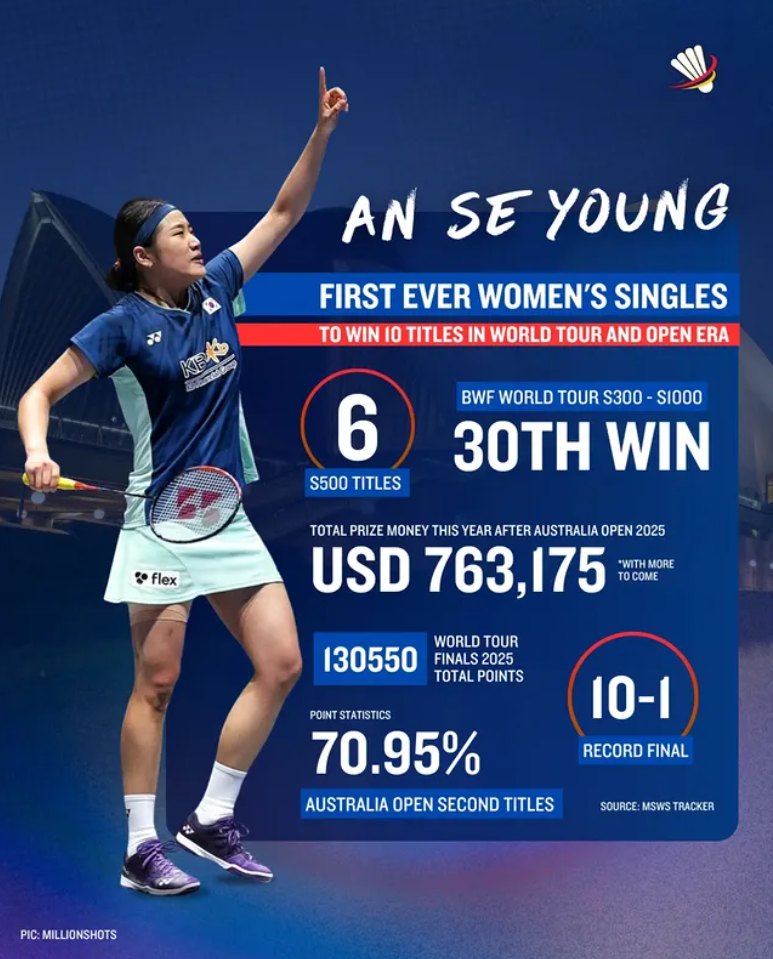 종전까지 단일 시즌 여자 단식 최다 우승 횟수는 9회였는데, 안세영이 호주 오픈을 우승하면서 10관왕을 달성해 단일 시즌 여자 단식 최다 우승 신기록을 세웠다.