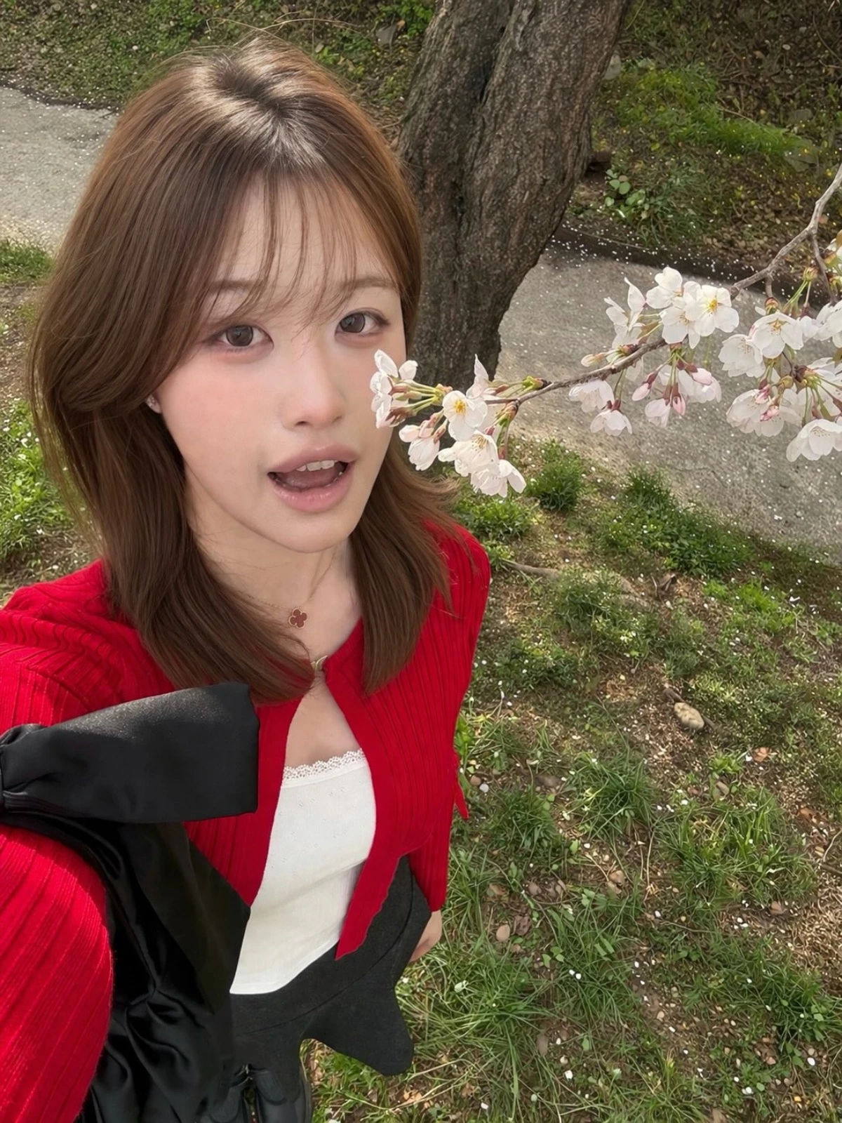 공개된 사진 속 김사윤은 흰색 탑에 붉은색 가디건, 짧은 치마를 매치한 상태로 벚꽃놀이를 즐기는 모습이다.